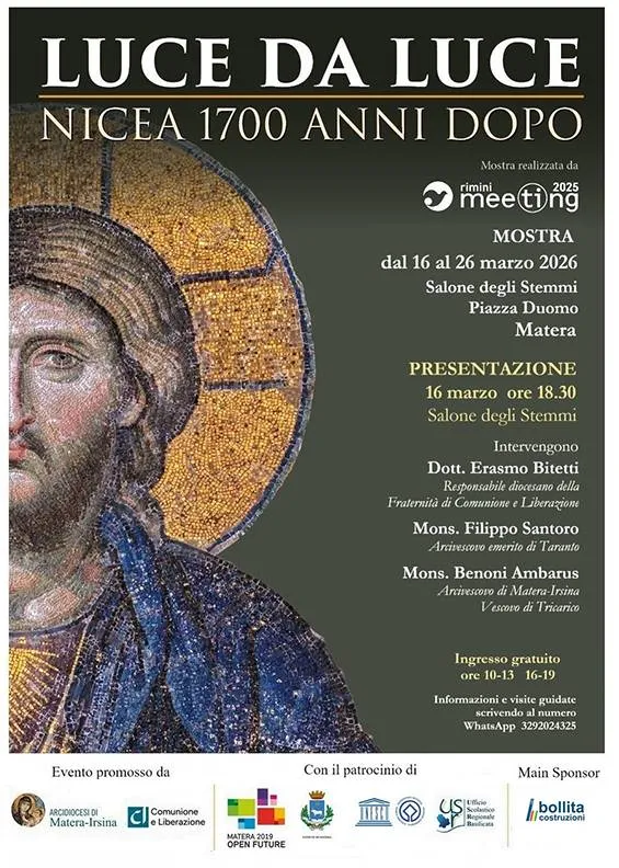 La Diocesi di Matera-Irsina ospiterà, nel Salone degli Stemmi dell’Episcopio di Matera, dal 16 al 26 marzo 2026, la mostra “Luce da Luce. Nicea 1700 anni dopo“.