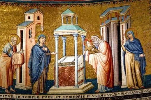 Quando furono compiuti i giorni della loro purificazione rituale, secondo la legge di Mosè, Maria e Giuseppe portarono il bambino a Gerusalemme per presentarlo al Signore – come è scritto nella legge del Signore: «Ogni maschio primogenito sarà sacro al Signore» – e per offrire in sacrificio una coppia di tortore o due giovani colombi, come prescrive la legge del Signore.