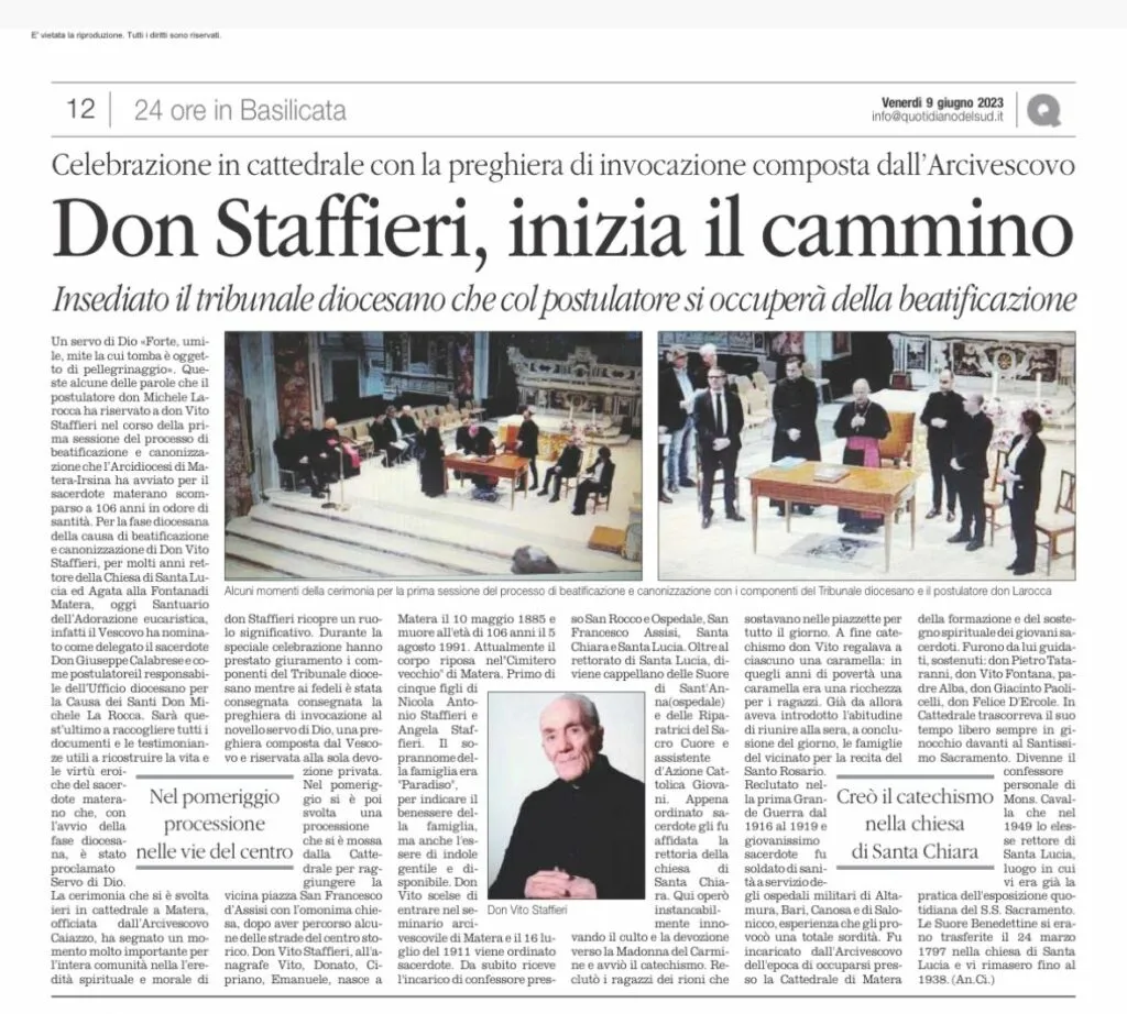 Apertura del processo di canonizzazione di don Vito Staffieri Ufficio per la causa dei Santi Matera: al via processo di beatificazione di don Vito Staffieri