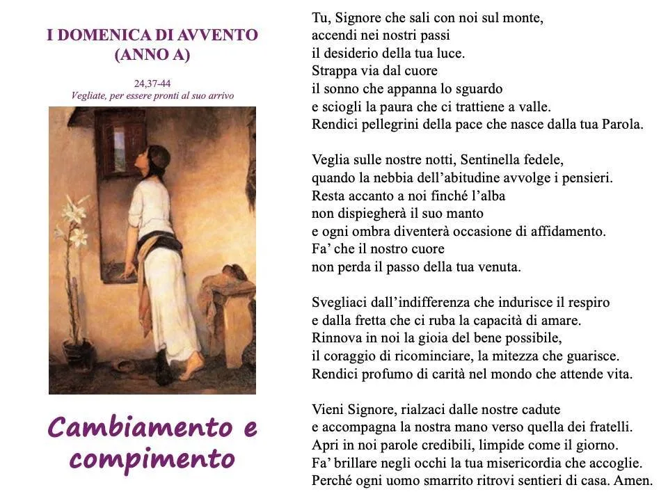 Nel tempo liturgico dell’Avvento risuona l’annuncio della «parousia», ossia della presenza di Dio nella storia, e l’esortazione all’attesa, intesa in senso dinamico, quale tensione verso Dio che viene a salvarci. Con un linguaggio volutamente provocatorio Gesù vuole attirare l’attenzione su ciò che veramente conta nella vita distogliendola dall’esclusiva cura degli interessi personali. Nella pagina evangelica della domenica che inaugura un nuovo anno liturgico, Gesù parla della sua venuta. La celebrazione del Natale, con cui culminerà il tempo dell’Avvento, ci ricorda che in Gesù bambino si manifesta la bontà di Dio che si fa uno di noi in tutto. Infatti, canteremo con Sant’Alfonso Maria De Liguori: «Tu scendi dalle stelle, o Re del cielo e vieni in una grotta al freddo e al gelo». Nel Libro dell’Apocalisse Gesù, crocifisso e risorto si presenta come «Colui che è, che era e che viene». Dio viene in mezzo a noi per camminare insieme a noi, abitare la nostra casa, essere partecipe e condividere le nostre gioie e i nostri dolori, fatiche e successi. Egli viene per accompagnarci verso la Casa di Padre e fare festa con Lui. La presenza di Dio non è invasiva ma discreta e propositiva. Egli viene, bussa alla porta del cuore, chiama per nome, si appella alla coscienza e nel silenzio resta in attesa della nostra risposta.