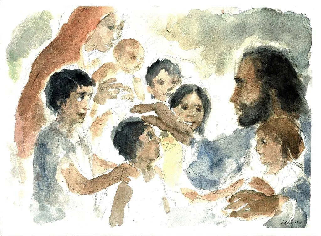 Il v. 13 descrive la scena che ritrae dei bambini portati a Gesù perché li benedicesse, imponendo la mano su di loro, e la reazione scomposta dei discepoli che impediscono il contatto col Maestro. Questo atteggiamento dei discepoli suscita lo sdegno di Gesù che prende fermamente le distanze da quel maldestro modo di fare. Il comportamento dei discepoli è in netta contrapposizione con lo stile di Gesù. Essi si ergono a difensori della sua persona creando un cordone di sicurezza contro persone che vengono percepite come una fastidiosa minaccia. I bambini rappresentano i membri della comunità più fragili e maggiormente esposti al peccato. I discepoli devono preoccuparsi di più che essi possano sperimentare la tenerezza terapeutica di Dio piuttosto che ergersi a custodi di norme e giudici inflessibili dei fratelli peccatori. I bambini, come tutti coloro che sono consapevoli del loro peccato, trovano consolazione e speranza solo in Dio. La compassione non misconosce il peccato ma ha uno sguardo più intelligente per cogliere, al di là della debolezza, la dignità della persona, la sua vocazione alla felicità e il comune bisogno di amore. Solo questo sguardo di compassione permette che il ministero dei discepoli non devii verso una fredda e fiscale pratica di precetti ma nel suo esercizio sia orientato dal principio dell’amore creativo e dal fine della comunione familiare.