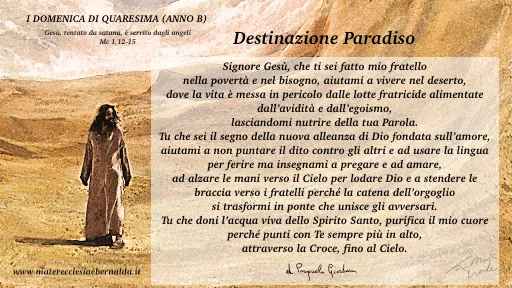 Giovanni Battista battezzava nel deserto (Mc 1, 4) e lì Gesù lo raggiunge per farsi battezzare da lui nel fiume Giordano (Mc 1, 9). Il battesimo di Gesù è il momento in cui viene consacrato da Dio. Avviene una liturgia nella quale lo Spirito Santo scende su di lui e la voce del Padre gli rivela la sua vocazione: «Tu sei il Figlio mio, l’amato». È quello che avviene anche nel nostro battesimo! Dio ci dona il suo Spirito per diventare tutti figli suoi. È dunque questa la nostra vocazione, ovvero la meta del nostro cammino esistenziale. Gesù, il Crocifisso Risorto battezzato nel Giordano, rappresenta ogni uomo con il quale Dio vuole stipulare una nuova alleanza, non fondata sul dovere e i precetti, ma sull’amore. Dio vuole essere Padre e Madre per l’uomo e spera che ogni uomo voglia essere figlio suo. Nella prima lettura (Gn 9, 8-15) Dio parla con Noè, salvato dalle acque del diluvio, immagine del nostro battesimo, per annunciargli la sua intenzione. Parla del segno dell’alleanza basata sulla sua misericordia. Il segno è l’arcobaleno che indica la rinuncia al male e alla vendetta ed è il simbolo del suo amore fedele per il quale s’impegna verso l’uomo ad usare solo il bene. È Gesù il segno dell’alleanza di Dio. Egli viene in mezzo agli uomini per mostrare di Dio il volto della misericordia, del Padre che nutre nel deserto i suoi figli (Os 11) e dello Sposo che sempre nel deserto sposa la sua amata (Os 2-3).