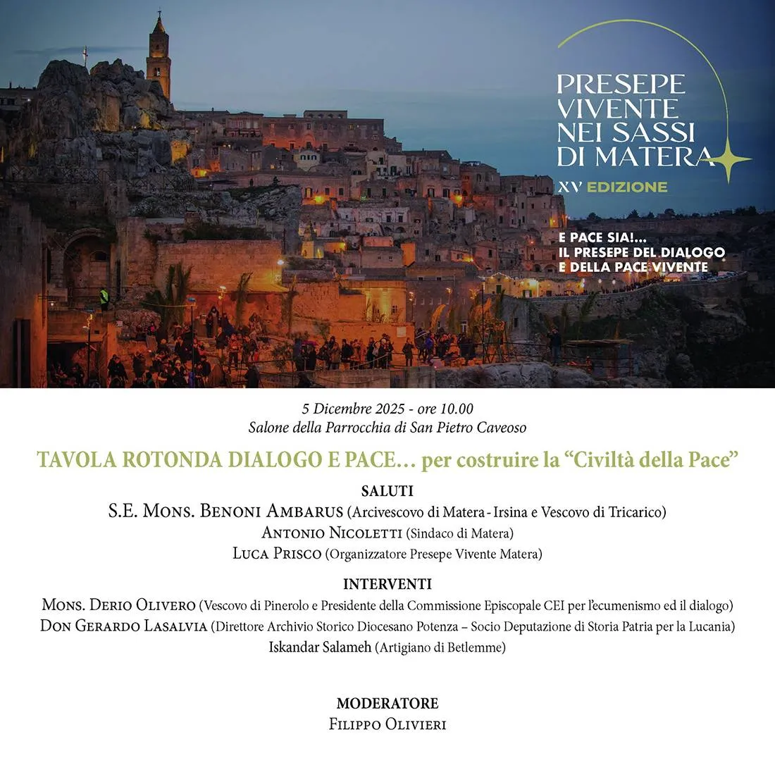 Le diocesi di Matera-Irsina e di Tricarico promuovono, all’inizio dell’Avvento e nel giorno inaugurale del Presepe vivente di Matera, la tavola rotonda “Dialogo e Pace… per costruire la Civiltà della Pace”, in programma venerdì 5 dicembre alle ore 10.00 nel Salone della Chiesa di San Pietro Caveoso a Matera.