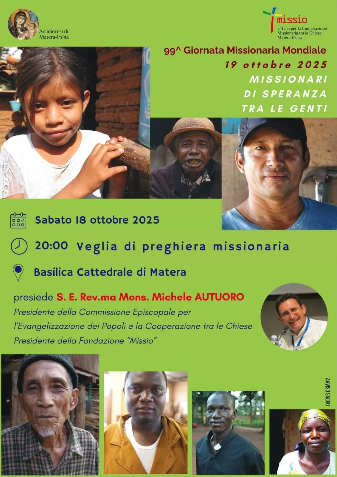 Siamo alla vigilia della penultima domenica di ottobre in cui ogni anno si celebra la Giornata Missionaria Mondiale. Ci prepariamo questa sera ore 20 con una veglia missionaria in Cattedrale, presieduta da S. E. Rev.ma Mons. Michele Autuoro, Presidente della Commissione Episcopale per l’Evangelizzazione dei Popoli e la Cooperazione tra le Chiese e della Fondazione “Missio”.