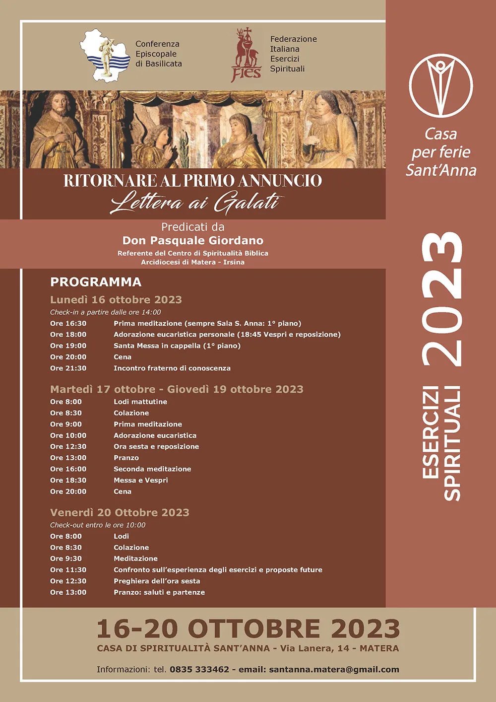 Esercizi spirituali 2023 + Aggiungi a Google Calendar + iCal / Outlook export Data Ott 17 2023 Expired! Ora All Day Categoria Evento diocesano Condividi questo evento Search for:Search Button Articoli recenti Il Signore viene a portare la gioia della salvezza – III DOMENICA DI AVVENTO (ANNO A) – GAUDETE – Lectio divina “Dialogo e Pace… per costruire la Civiltà della Pace” Dall’acqua del peccato che mortifica al fuoco dello Spirito che vivifica – II DOMENICA DI AVVENTO (ANNO A) – Lectio divina “Una vita di interessi”. Convegno della Fondazione Lucana Antiusura nel 31° anniversario della sua istituzione Azione Cattolica. Al Santuario di Picciano il 29 novembre si apre il nuovo anno associativo Commenti recenti