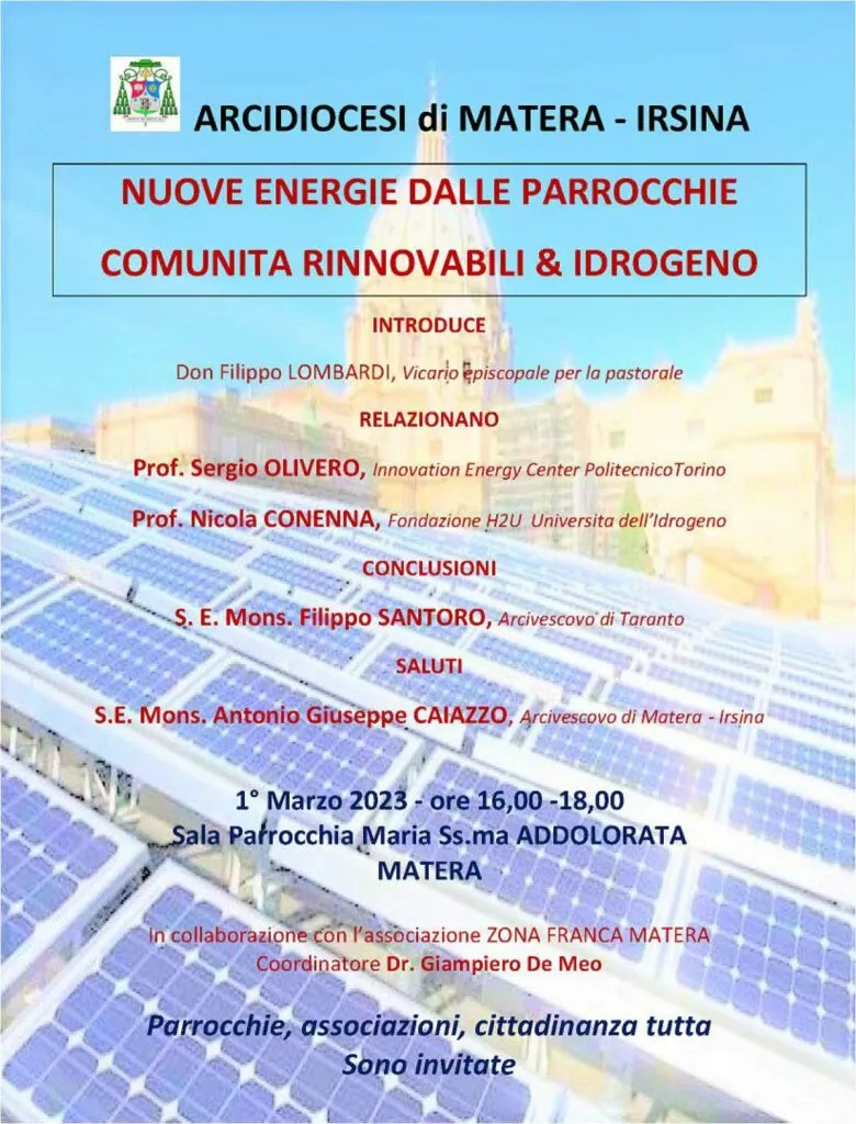 Incontro: Nuove energie dalle parrocchie. Comunità rinnovabili & idrogeno + Aggiungi a Google Calendar + iCal / Outlook export Data Mar 01 2023 Expired! Ora 16:00 - 18:00 Luogo Parrocchia Maria SS. Addolorata - Matera Viale delle Nazioni Unite, 53 - Matera Categoria Evento diocesano Condividi questo evento Search for:Search Button Articoli recenti Il Signore viene a portare la gioia della salvezza – III DOMENICA DI AVVENTO (ANNO A) – GAUDETE – Lectio divina “Dialogo e Pace… per costruire la Civiltà della Pace” Dall’acqua del peccato che mortifica al fuoco dello Spirito che vivifica – II DOMENICA DI AVVENTO (ANNO A) – Lectio divina “Una vita di interessi”. Convegno della Fondazione Lucana Antiusura nel 31° anniversario della sua istituzione Azione Cattolica. Al Santuario di Picciano il 29 novembre si apre il nuovo anno associativo Commenti recenti