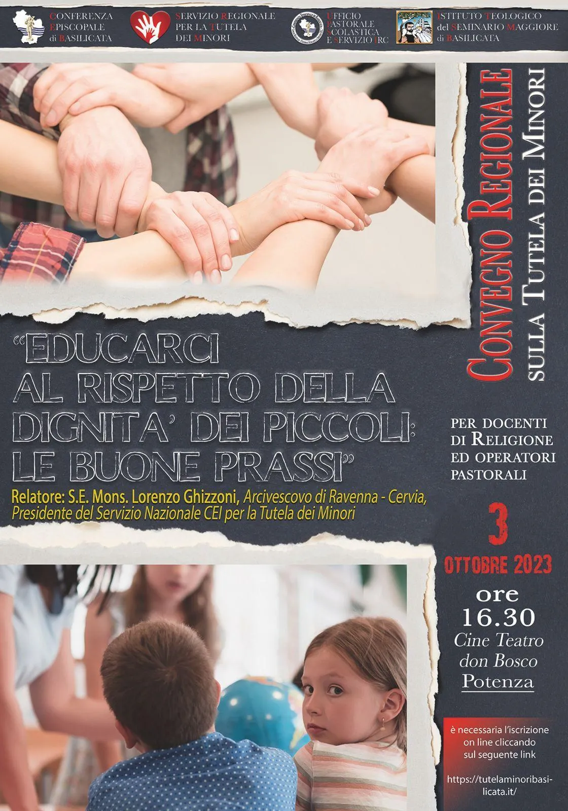 Primo Convegno Regionale sulla tutela dei Minori dal titolo: “Educarci al rispetto della dignità dei piccoli: Le buone prassi” che si terrà il 3 ottobre p.v. alle ore 16.30 presso Il Cine Teatro don Bosco a Potenza. Guiderà nella riflessione S. E. Mons. Lorenzo Ghizzoni, Arcivescovo di Ravenna-Cervia e Presidente del Servizio Nazionale CEI per la Tutela dei Minori.