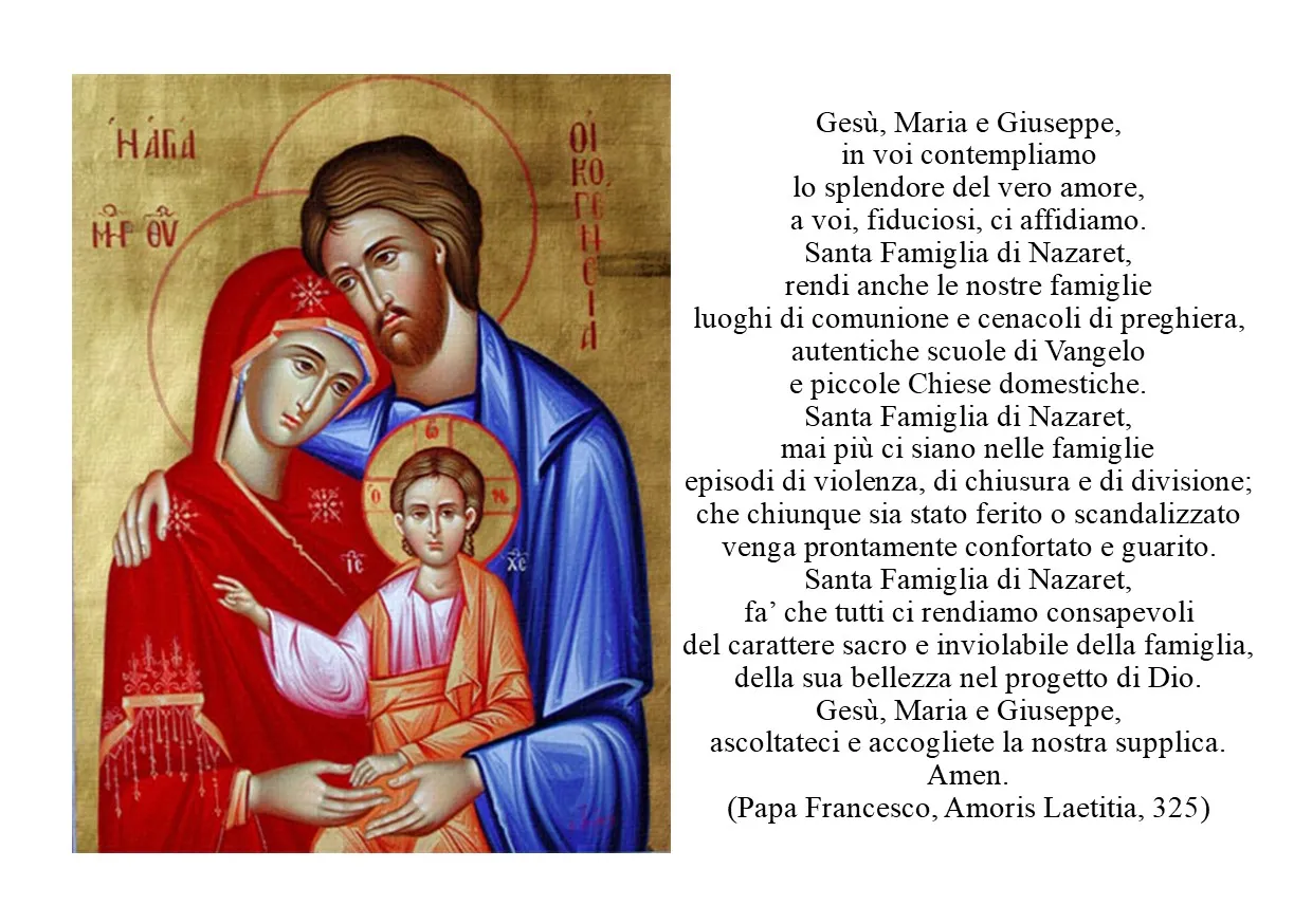 Festa della Santa Famiglia di Gesù, Maria e Giuseppe 31 Dicembre 2023 Ufficio per la Pastorale della famiglia Alla fine della celebrazione eucaristica, dopo l’orazione post-communio, si suggerisce la preghiera del Santo Padre per la famiglia. Il testo della preghiera potrebbe esser stampato in forma adeguata e lasciato per la preghiera famigliare domestica. Preghiera-famigliaDownload