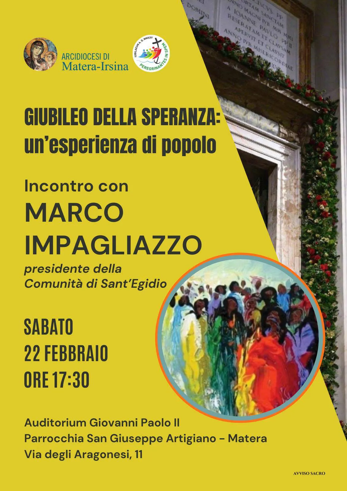 Sabato 22 febbraio, alle ore 17:30, nell’Auditorium della Parrocchia San Giuseppe Artigiano, in Via degli Aragonesi 11, si terrà un incontro dal titolo “Giubileo della speranza: un’esperienza di popolo”, con la partecipazione di Marco Impagliazzo, Presidente della Comunità di Sant’Egidio.