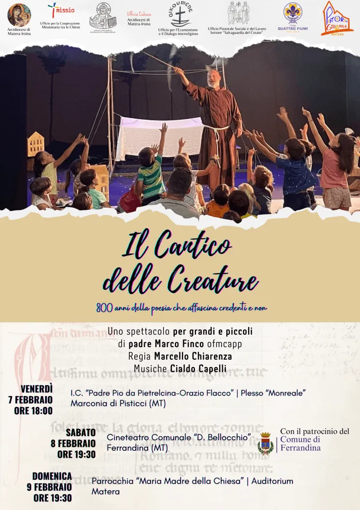 In Diocesi ospiteremo la rappresentazione de “Il cantico delle creature” di padre Marco Finco, frate cappuccino, regista e attore, in ciascuna delle tre vicarie della Diocesi: