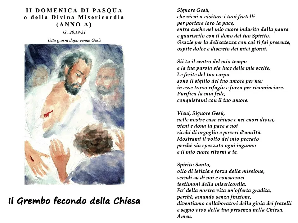 Infine, il Vangelo conduce a contemplare la vocazione missionaria che scaturisce dalla Pasqua. Una comunità che ha ricevuto pace, Spirito e perdono non può trattenere questi doni per sé. Essa è inviata nel mondo perché altri possano entrare nella stessa esperienza di riconciliazione e di vita. La Chiesa è feconda non quando si limita a custodire sé stessa, ma quando genera figli alla fede, quando accompagna i lontani, quando fascia le ferite dell’uomo, quando offre nel nome di Cristo la misericordia che ha ricevuto. È grembo perché accoglie; è feconda perché dona vita; è madre perché attraverso la Parola, i sacramenti e la carità rende possibile l’incontro con il Risorto. In questa luce, la Divina Misericordia non appare come un tema devozionale aggiunto dall’esterno al Vangelo della domenica, ma come una sua sintesi profondamente evangelica. La misericordia è il nome della Pasqua vissuta dalla Chiesa. È il Risorto che entra a porte chiuse senza essere fermato dai nostri limiti. È la pace data a chi aveva tradito. È il costato aperto come sorgente di vita. È lo Spirito che ricrea ciò che il peccato aveva deformato. È la pazienza con cui Gesù attende Tommaso e lo conduce alla fede. È la beatitudine concessa a quanti, senza vedere, si affidano alla testimonianza apostolica. È, infine, la possibilità offerta a ciascuno di noi di rinascere continuamente come figli di Dio e fratelli tra noi.