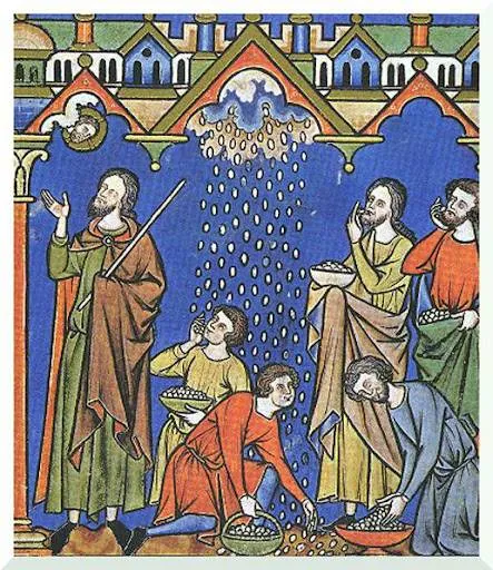 La sera le quaglie salirono e coprirono l’accampamento; al mattino c’era uno strato di rugiada intorno all’accampamento. Quando lo strato di rugiada svanì, ecco, sulla superficie del deserto c’era una cosa fine e granulosa, minuta come è la brina sulla terra. Gli Israeliti la videro e si dissero l’un l’altro: «Che cos’è?», perché non sapevano che cosa fosse. Mosè disse loro: «È il pane che il Signore vi ha dato in cibo».