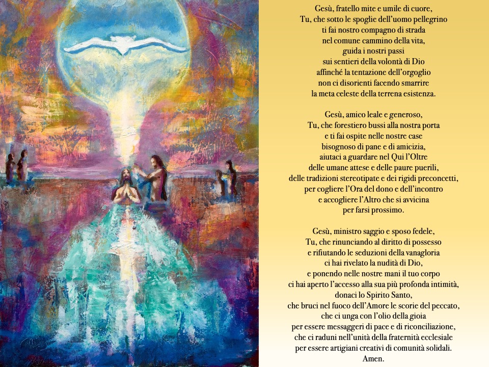 Il battesimo è l’epifania di Dio che rivela in Gesù il volto della bontà, tenerezza e misericordia. Il punto di vista di Gesù è quello del figlio amato che, lasciandosi guidare dalla Parola di Dio, attraversa le acque dell’umiliazione della morte – prova suprema che riassume in sé tutte le tentazioni – per lasciarsi condurre verso la terra promessa del cielo. La strada che Dio apre davanti a Gesù passa dai vicoli più bui dell’umanità ferita per giungere fino alla croce, che rappresenta la chiave di accesso al cielo. Il figlio amato è tale perché il Padre lo sostiene e lo accompagna con la forza dello Spirito nella sua missione nella quale, in obbedienza alla volontà di Dio, si fa servo dei fratelli. Come il Battista, anche i discepoli di Gesù che lo riconoscono come il Cristo, devono seguirlo imparando da lui ad essere discepoli del regno di Dio. Gesù li introduce nella conoscenza della sapienza di Dio e nell’esperienza della Sua misericordia, affinché “battezzati” nelle acque dell’umanità benedetta da Dio, possano essere a loro volta battezzatori di tutti i popoli (Mt 28,19-20).