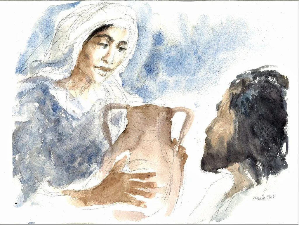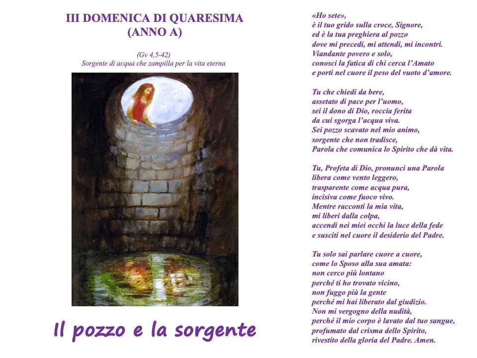 Un pozzo fa da sfondo all’incontro tra Gesù e una donna Samaritana. Noi che abbiamo l’acqua in casa o che, in genere, abbiamo la possibilità di reperirla con facilità all’occorrenza, non sappiamo cosa sia la fatica nel soddisfare la sete. Per questo l’acqua è un bene che noi occidentali corriamo il rischio di non apprezzare nel suo valore. La sete è la cifra simbolica del bisogno fondamentale di essere amati per vivere. Gesù, che ha cambiato l’acqua in vino a Cana di Galilea, salvando così la festa di matrimonio che rischiava di fallire miseramente, non avrebbe potuto ristorare la sua fatica operando un prodigio? La domanda ci richiama la tentazione nella quale Gesù è invitato dal demonio a soddisfare la sua fame cambiando le pietre del deserto in pane da mangiare. La rinuncia a vivere per sé stessi porta a scoprire nella mancanza di cibo un bisogno più profondo che solo la Parola di Dio può soddisfare. Non potremmo scoprire il nostro bisogno più vitale che ci abita se non incontrassimo Dio che ci parla essendo lui stesso bisognoso. Gesù, al contrario degli apostoli che erano andati al villaggio a procurarsi da mangiare, rimane in attesa della donna alla quale si mostra bisognoso d’aiuto.