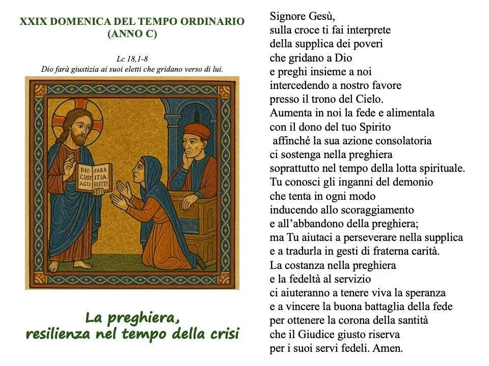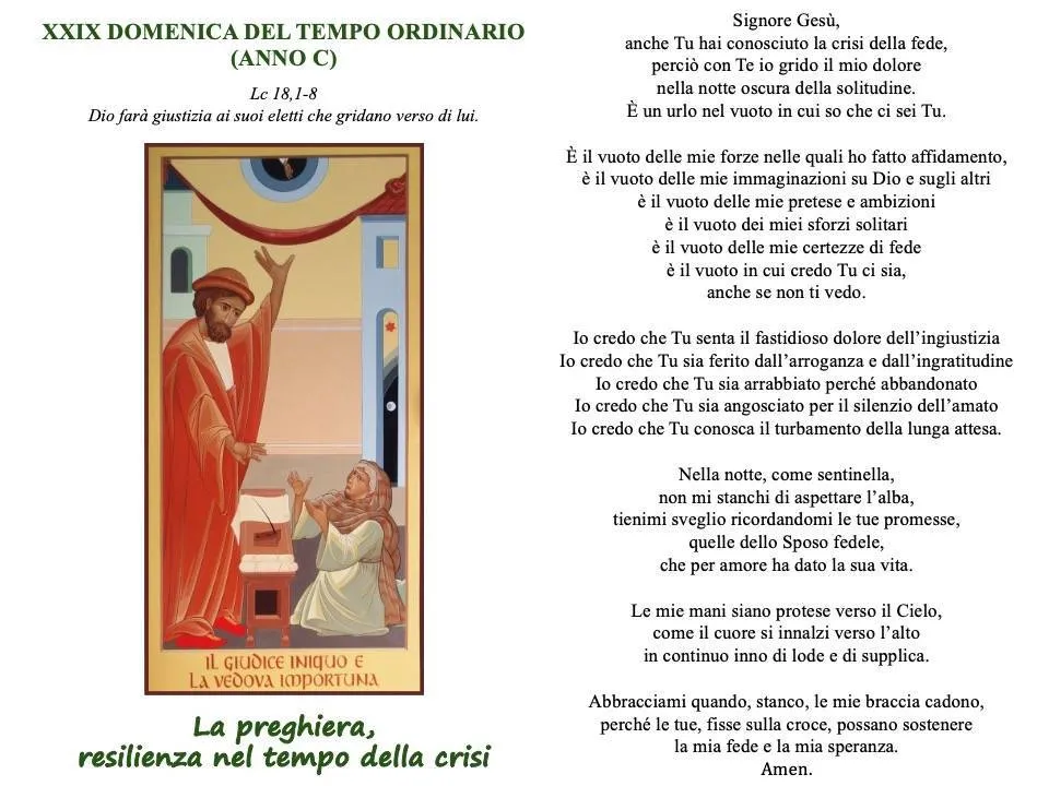Continua la catechesi di Gesù sulla preghiera. Due domeniche fa con i discepoli abbiamo chiesto a Gesù di aumentare la nostra fede affinché, riponendo la fiducia solamente nel Signore, possiamo imitarlo soprattutto in quelle cose che ci appaiono impossibili da realizzare. Con i lebbrosi domenica scorsa abbiamo chiesto al Maestro di avere misericordia e di donarci la parola per sentirci vivi pur nelle tante mortificazioni. Con il Samaritano viviamo l’eucaristia domenicale come un pellegrinaggio gioioso verso il Signore per lodarlo e ringraziarlo. In questa domenica ci viene proposta la figura parabolica di una vedova che con insistenza si rivolge al giudice della sua città: «Fammi giustizia contro il mio avversario».