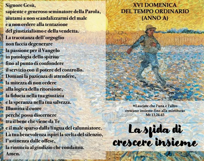 In quel tempo, 24Espose loro un’altra parabola, dicendo: “Il regno dei cieli è simile a un uomo che ha seminato del buon seme nel suo campo. 25Ma, mentre tutti dormivano, venne il suo nemico, seminò della zizzania in mezzo al grano e se ne andò. 26Quando poi lo stelo crebbe e fece frutto, spuntò anche la zizzania. 27Allora i servi andarono dal padrone di casa e gli dissero: “Signore, non hai seminato del buon seme nel tuo campo? Da dove viene la zizzania?”. 28Ed egli rispose loro: “Un nemico ha fatto questo!”. E i servi gli dissero: “Vuoi che andiamo a raccoglierla?”. 29“No, rispose, perché non succeda che, raccogliendo la zizzania, con essa sradichiate anche il grano. 30Lasciate che l’una e l’altro crescano insieme fino alla mietitura e al momento della mietitura dirò ai mietitori: Raccogliete prima la zizzania e legatela in fasci per bruciarla; il grano invece riponetelo nel mio granaio””.