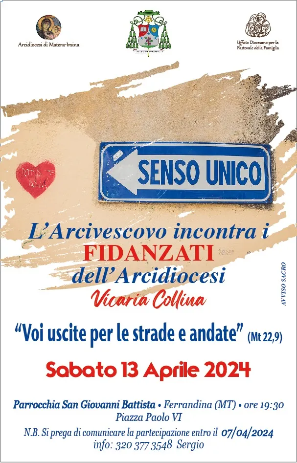 Sabato 13 Aprile 2024 presso i saloni parrocchiali di San Giovanni Battista – Ferrandina, alle ore 19:30 si terrà l’incontro del nostro Arcivescovo con i fidanzati dell’Arcidiocesi che seguono i percorsi di preparazione al matrimonio nella Vicaria Collina.
