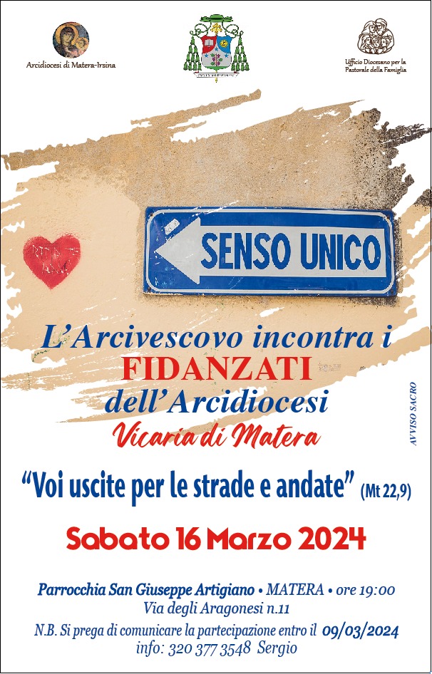 Sabato 16 Marzo 2024 presso i saloni parrocchiali di San Giuseppe Artigiano – Matera, alle ore 19 si terrà l’incontro del nostro Arcivescovo con i fidanzati dell’Arcidiocesi che seguono i percorsi di preparazione al matrimonio nella Vicaria di Matera.