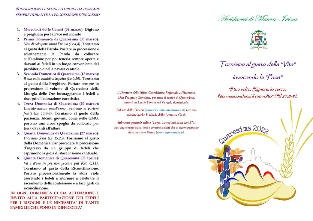 Sul nostro giornale online “Logos. Le ragioni della verità” si possono trovare riflessioni e comunicazioni che ci accompagnano durante tutto l’anno (www.logosmatera.it).