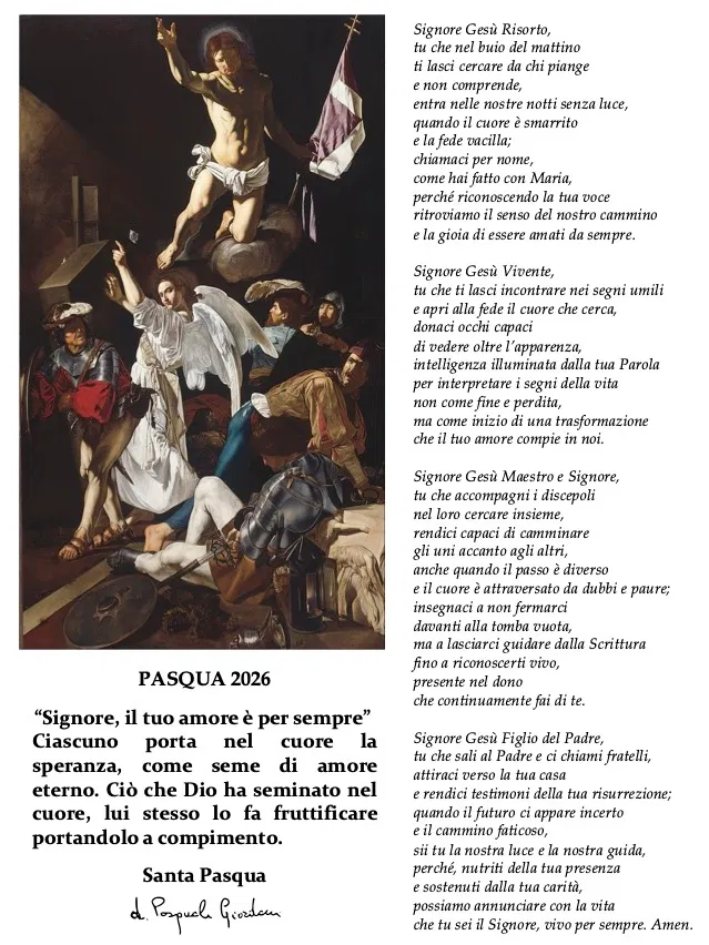 Dov’è Gesù? Se lo cerchi come Maria Maddalena tra le lacrime e non ti arrendi all’apparenza, lo troverai lì ad attenderti, Lui che ti chiama per nome perché ti conosce da sempre; se sei in cammino verso la casa paterna o nel cenacolo con le tue paure, i tuoi dubbi e le tue resistenze interiori, Egli ti si accosterà e ascolterà il tuo cuore e ti aprirà gli occhi per riconoscerlo vivo; se sei a mensa con i tuoi fratelli nella comune preghiera e nella carità fraterna, Lui passerà ancora a servirti il vino della gioia.