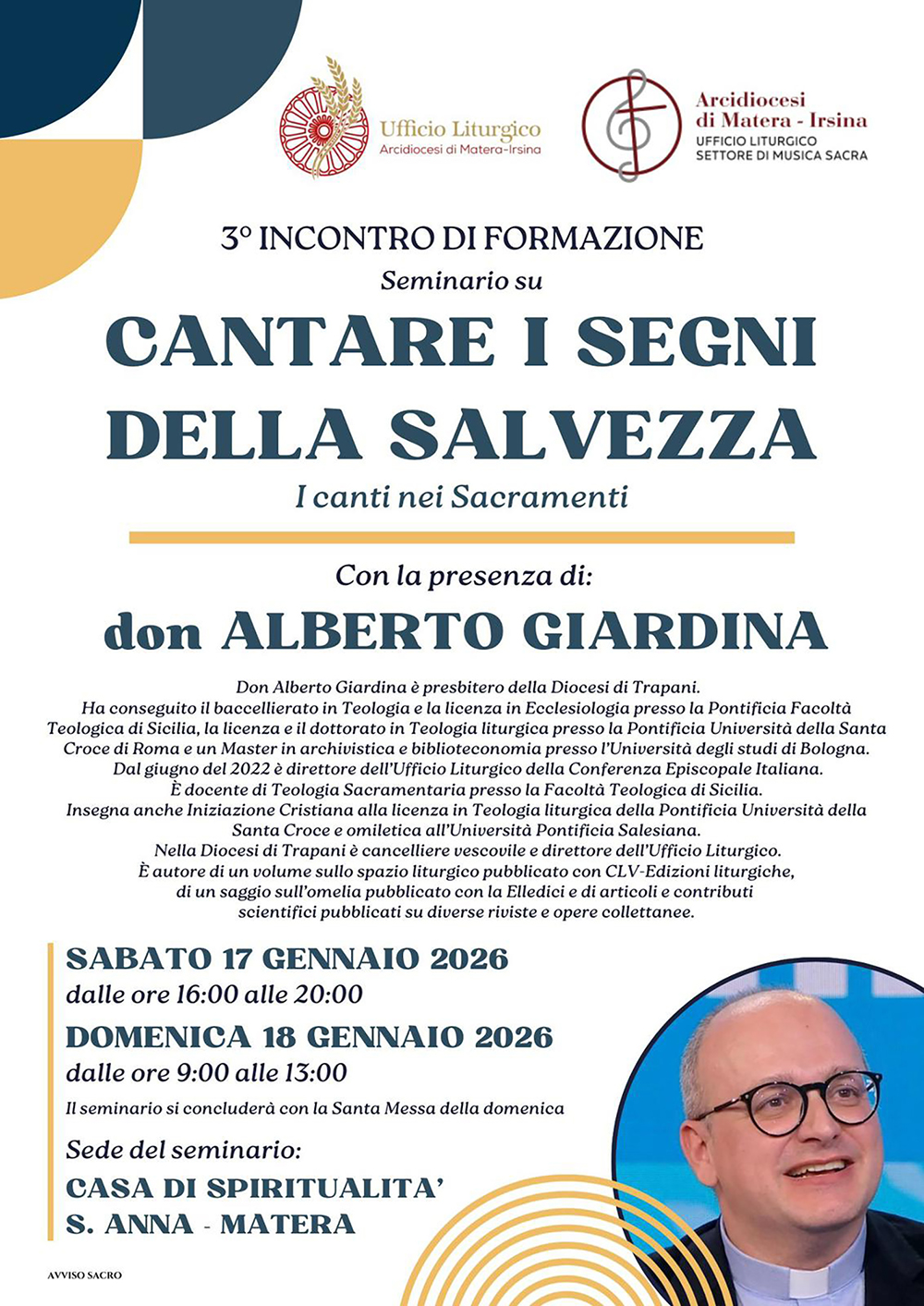 L’Ufficio Liturgico dell’Arcidiocesi di Matera-Irsina (Settore di Musica Sacra) promuove il 3° Incontro di Formazione, un seminario dedicato al rapporto tra liturgia e canto dal titolo “Cantare i segni della salvezza. I canti nei Sacramenti”, con la presenza di don Alberto Giardina.