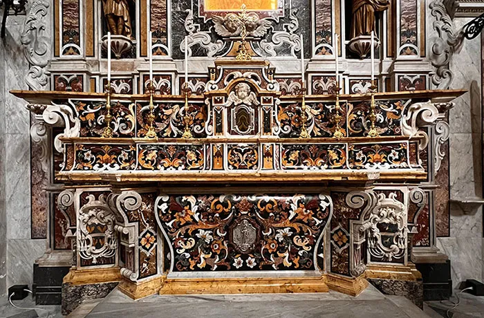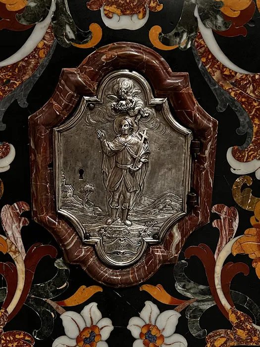 Nel 1731 con la realizzazione del nuovo altare maggiore, una tarsia marmorea del maestro napoletano Cristoforo Battimelli, le stesse reliquie furono nuovamente collocate. La portella in argento sbalzato che ne permette l’ispezione raffigura il Santo immerso in un paesaggio rurale con i simboli della fede (croce), del martirio (palma) e della gloria (ghirlanda fiorita).