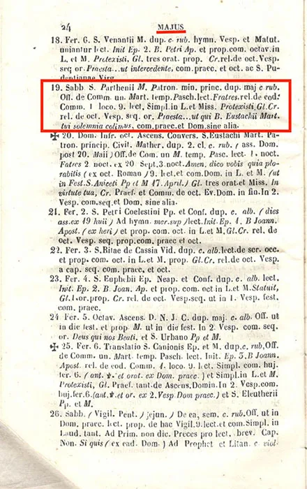 Il 19 maggio la Chiesa celebra la memoria dei santi martiri Partenio e Calogero. Nel Martirologio romano si legge: «Sempre a Roma, santi Partenio e Calogero, martiri, che, sotto l’imperatore Diocleziano, resero insigne testimonianza a Cristo».