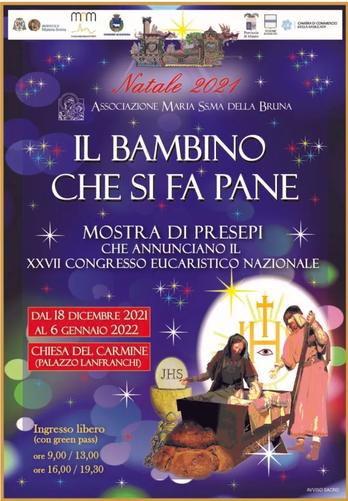 L’Associazione Maria SS. della Bruna partecipa alle iniziative attivate per Natale 2021 dal Comune di Matera con la realizzazione di un allestimento presepiale che annuncia l’importante evento ecclesiale che interesserà Matera l’anno prossimo: il 27° Congresso Eucaristico Nazionale.