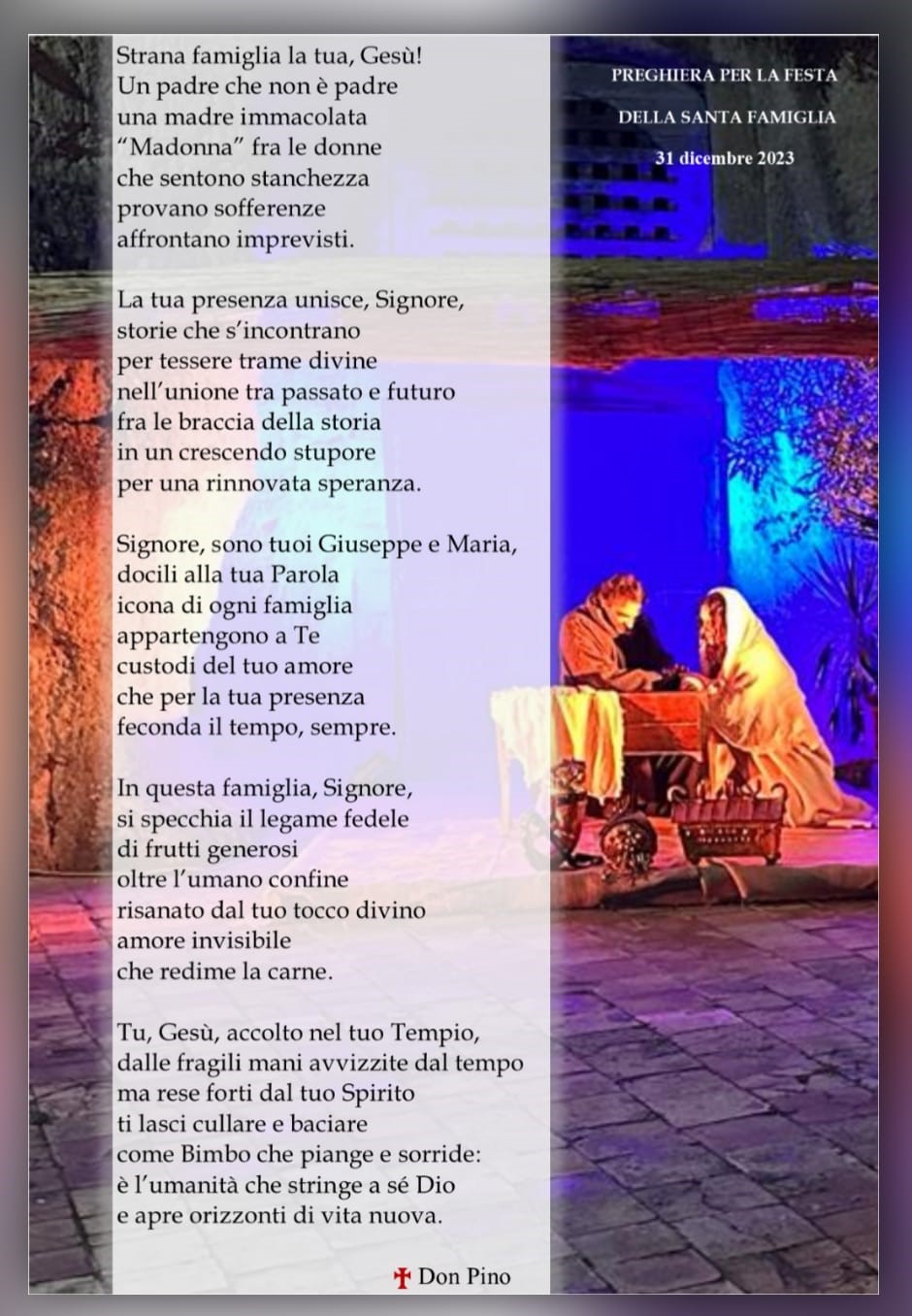 Omelia di S. E. l’Arcivescovo nella Santa Messa della notte di Natale Lunedì, 25 dicembre Preghiera di S. Ecc. l’Arcivescovo per il Santo Natale Lunedì, 25 dicembre Omelia di S. E. l’Arcivescovo nella Santa Messa del giorno di Natale Lunedì, 25 dicembre Natale del Signore – Lectio divina Lunedì, 25 dicembre Preghiera di S. Ecc. l’Arcivescovo per la Festa della Santa Famiglia Domenica, 31 dicembre Festa della Santa Famiglia. Lectio divina Domenica, 31 dicembre Preghiera dell’Arcivescovo per la Solennità di Maria SS. Madre di Dio Lunedì, 1 gennaio 2024 Solennità di Maria SS. Madre di Dio. Lectio divina Lunedì, 1 gennaio 2024 Preghiera dell’Arcivescovo per la Solennità dell’Epifania del Signore Sabato, 6 gennaio 2024 Solennità dell’Epifania del Signore. Lectio divina Sabato, 6 gennaio 2024 Preghiera dell’Arcivescovo per la Festa del Battesimo di Gesù Domenica, 7 gennaio 2024
