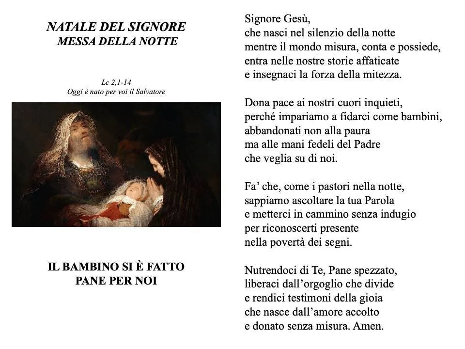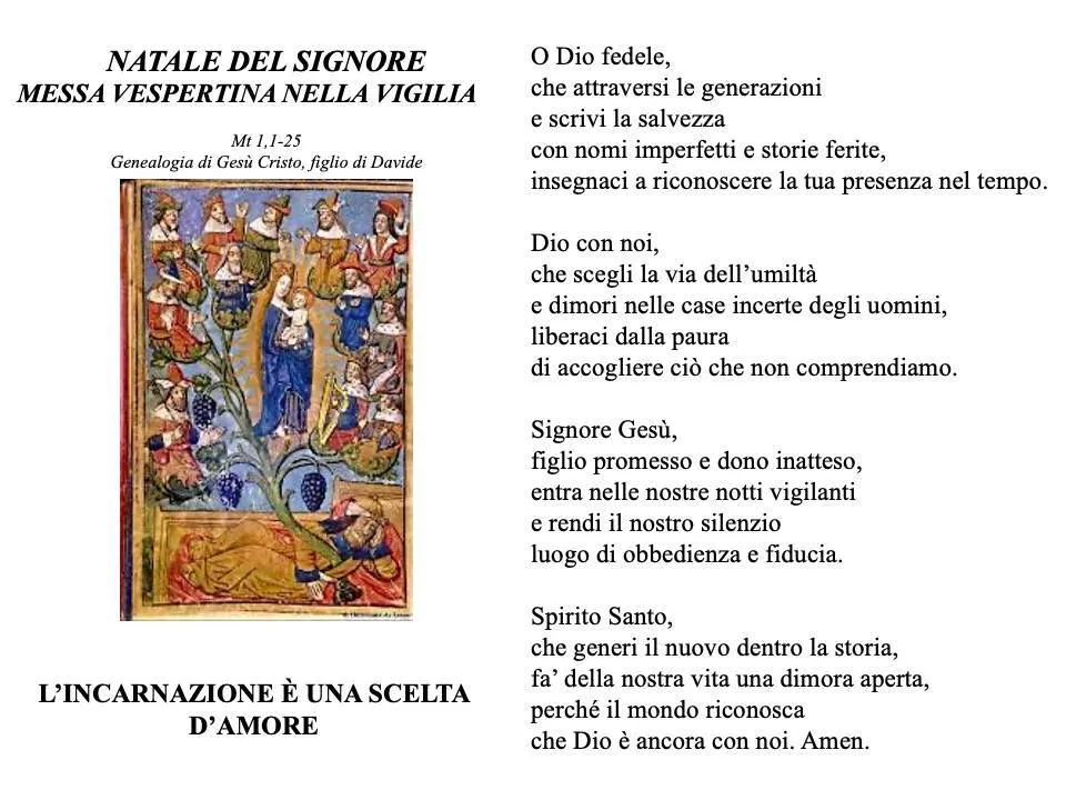 Il titolo “Emmanuele, Dio con noi” illumina l’intero racconto e ne svela la portata spirituale. Dio non salva dall’alto, ma stando dentro la storia; non elimina le ferite, ma le abita. Il Natale, letto alla luce di questo testo, non è un rifugio emotivo, ma una chiamata esigente: riconoscere che Dio viene là dove non lo avremmo previsto e ci chiede di fare spazio. Accogliere Cristo significa lasciarsi coinvolgere in un cammino che continua, diventando a nostra volta parte di quella genealogia di fede in cui Dio scrive ancora la sua presenza nel mondo.
