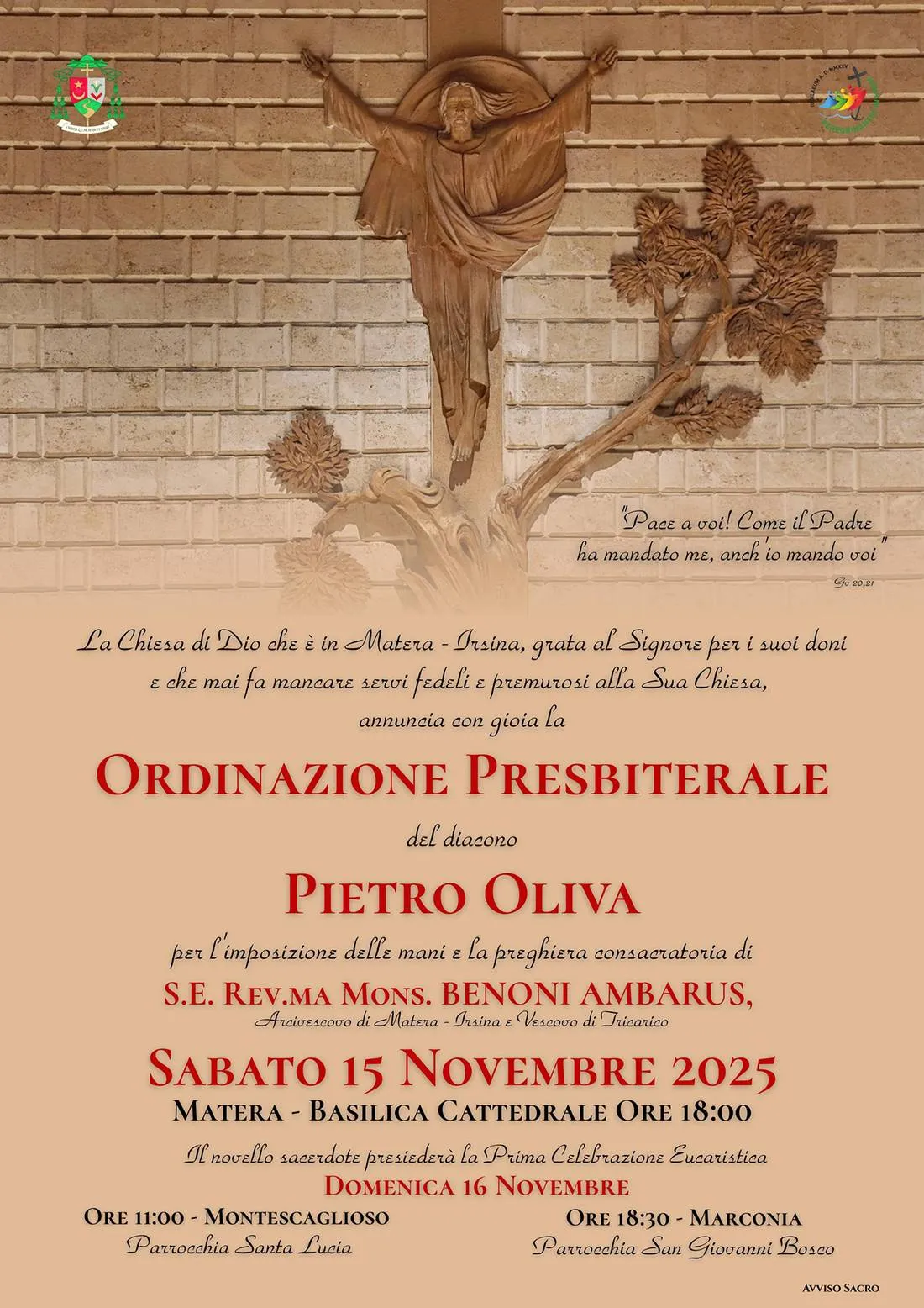 Ordinazione presbiterale del Diac. Pietro Oliva Eventi Sabato 15 novembre 2025 – ore 18.00, presso la Basilica Cattedrale di Matera