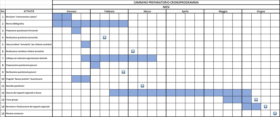 I “Lineamenta” suggeriscono, come prima pista di lavoro per il cammino preparatorio della settimana sociale, l’acquisizione di contributi che provengono da ricerche e studi fatti sul territorio dalle varie organizzazioni in esso operante, allo scopo di individuare “le principali questioni” e i “Nodi da sciogliere”. Questa attività, propedeutica alle indagini condotte sul territorio, risulta fondamentale per l’attività di sintesi finale del lavoro fatto.