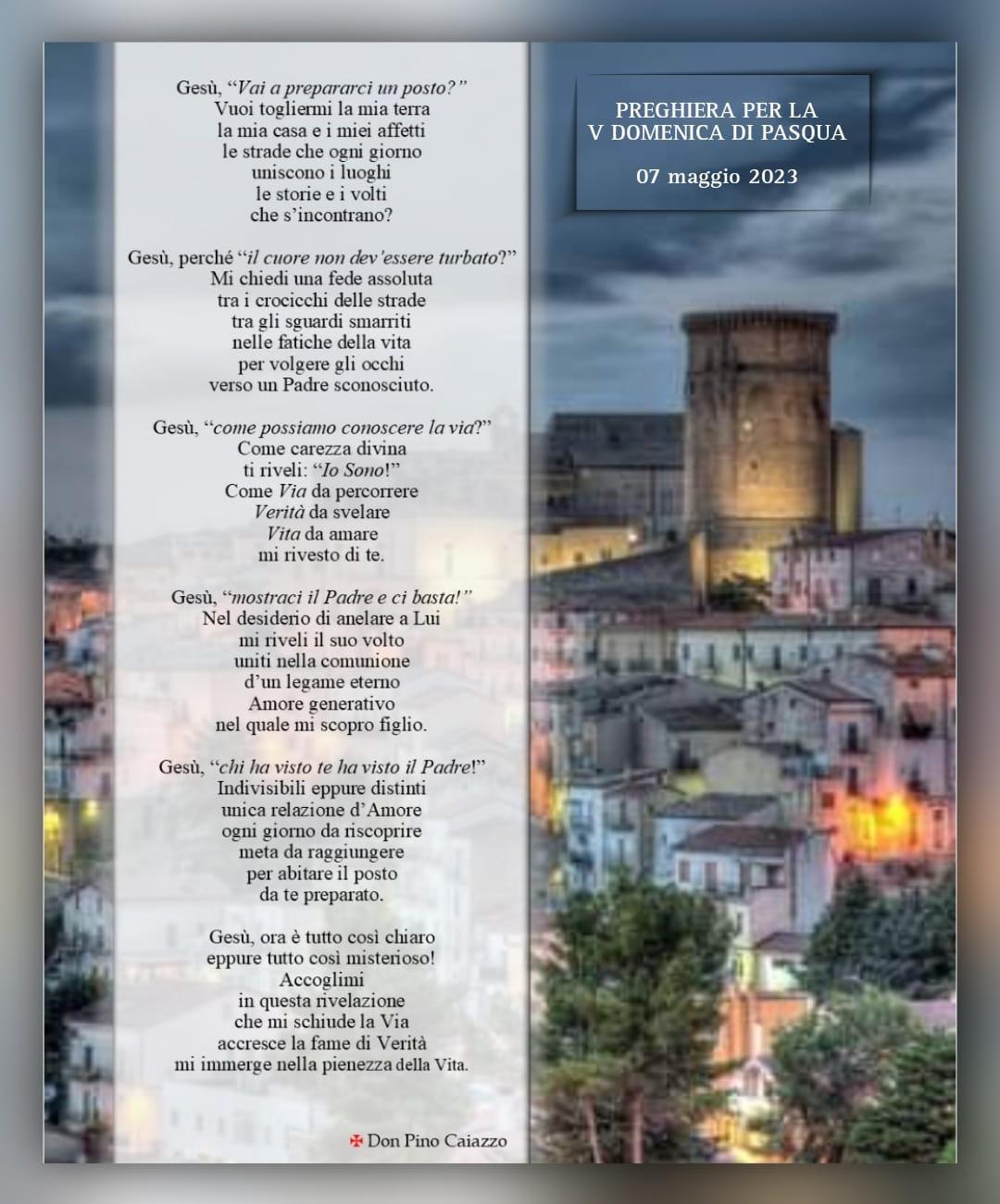 «…Gesù “come possiamo conoscere la via?” Come carezza divina ti riveli: “Io Sono!” Come Via da percorrere, Verità da svelare, Vita da amare, mi rivesto di te…». Preghiera composta da S. Ecc. l’Arcivescovo per la Quinta Domenica di Pasqua.