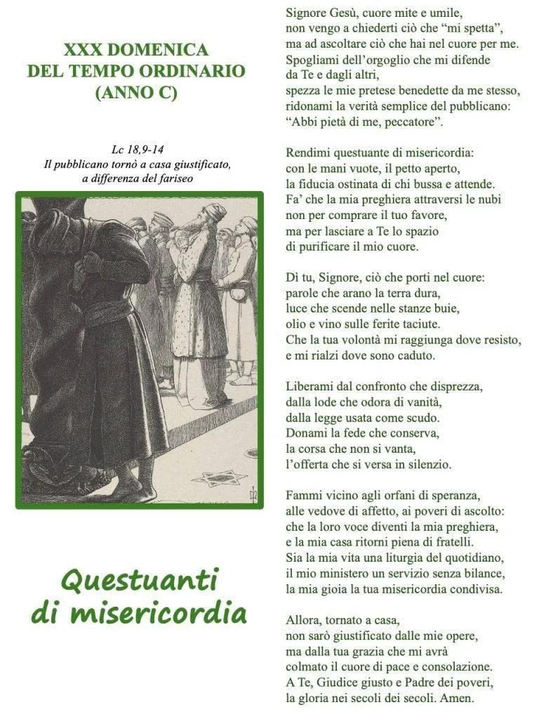 - Dove sento la tentazione del fariseo: autogiustificazione, confronto, disprezzo sottile? Quale gesto pratico di umiltà posso scegliere?