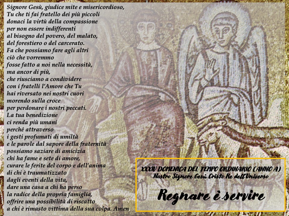 «31Quando il Figlio dell’uomo verrà nella sua gloria, e tutti gli angeli con lui, siederà sul trono della sua gloria. 32Davanti a lui verranno radunati tutti i popoli. Egli separerà gli uni dagli altri, come il pastore separa le pecore dalle capre, 33e porrà le pecore alla sua destra e le capre alla sinistra. 34Allora il re dirà a quelli che saranno alla sua destra: “Venite, benedetti del Padre mio, ricevete in eredità il regno preparato per voi fin dalla creazione del mondo, 35perché ho avuto fame e mi avete dato da mangiare, ho avuto sete e mi avete dato da bere, ero straniero e mi avete accolto, 36nudo e mi avete vestito, malato e mi avete visitato, ero in carcere e siete venuti a trovarmi”. 37Allora i giusti gli risponderanno: “Signore, quando ti abbiamo visto affamato e ti abbiamo dato da mangiare, o assetato e ti abbiamo dato da bere? 38Quando mai ti abbiamo visto straniero e ti abbiamo accolto, o nudo e ti abbiamo vestito? 39Quando mai ti abbiamo visto malato o in carcere e siamo venuti a visitarti?”. 40E il re risponderà loro: “In verità io vi dico: tutto quello che avete fatto a uno solo di questi miei fratelli più piccoli, l’avete fatto a me”. 41Poi dirà anche a quelli che saranno alla sinistra: “Via, lontano da me, maledetti, nel fuoco eterno, preparato per il diavolo e per i suoi angeli, 42perché ho avuto fame e non mi avete dato da mangiare, ho avuto sete e non mi avete dato da bere, 43ero straniero e non mi avete accolto, nudo e non mi avete vestito, malato e in carcere e non mi avete visitato”. 44Anch’essi allora risponderanno: “Signore, quando ti abbiamo visto affamato o assetato o straniero o nudo o malato o in carcere, e non ti abbiamo servito?”. 45Allora egli risponderà loro: “In verità io vi dico: tutto quello che non avete fatto a uno solo di questi più piccoli, non l’avete fatto a me”. 46E se ne andranno: questi al supplizio eterno, i giusti invece alla vita eterna”».