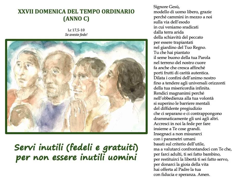 I discepoli recepiscono quanto distante sia il loro modo di pensare da quello di Gesù, perciò gli chiedono: aumenta la nostra fede! Probabilmente gli apostoli richiedono un surplus d’intelligenza per comprendere la logica nuova indicata da lui. La prima lettura ci offre una chiave di lettura per comprendere più profondamente la richiesta dei discepoli. Essi, come il profeta Abacuc, rivolgono una preghiera. La supplica si eleva da un cuore e una mente confusi. Il profeta, portavoce del turbamento del popolo che proietta in Dio il suo senso di giustizia, non comprende perché non intervenga prontamente contro i malvagi dando loro la punizione che si meritano. I discepoli, parimenti, hanno difficoltà ad accettare la pedagogia di Gesù che invita ad accogliere i peccatori, anzi a cercarli, ad abbracciarli, a conquistarli con la benevolenza, a perdonarli ogni volta che riconoscendosi colpevoli, chiedono pietà. Le parole del profeta sembrano una sfida lanciata verso il Dio silenzioso e apparentemente assente. Quelle dei discepoli esprimono la consapevolezza della loro povertà. La preghiera dell’uno e degli altri rivela la loro fede sebbene debole come una fiammella che Gesù però riconosce anche potenzialmente feconda.