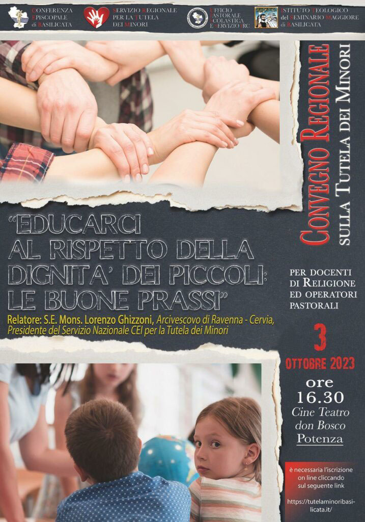 Primo Convegno Regionale sulla tutela dei Minori dal titolo: “Educarci al rispetto della dignità dei piccoli: Le buone prassi” che si terrà il 3 ottobre p.v. alle ore 16.30 presso Il Cine Teatro don Bosco a Potenza. Guiderà nella riflessione S. E. Mons. Lorenzo Ghizzoni, Arcivescovo di Ravenna-Cervia e Presidente del Servizio Nazionale CEI per la Tutela dei Minori.