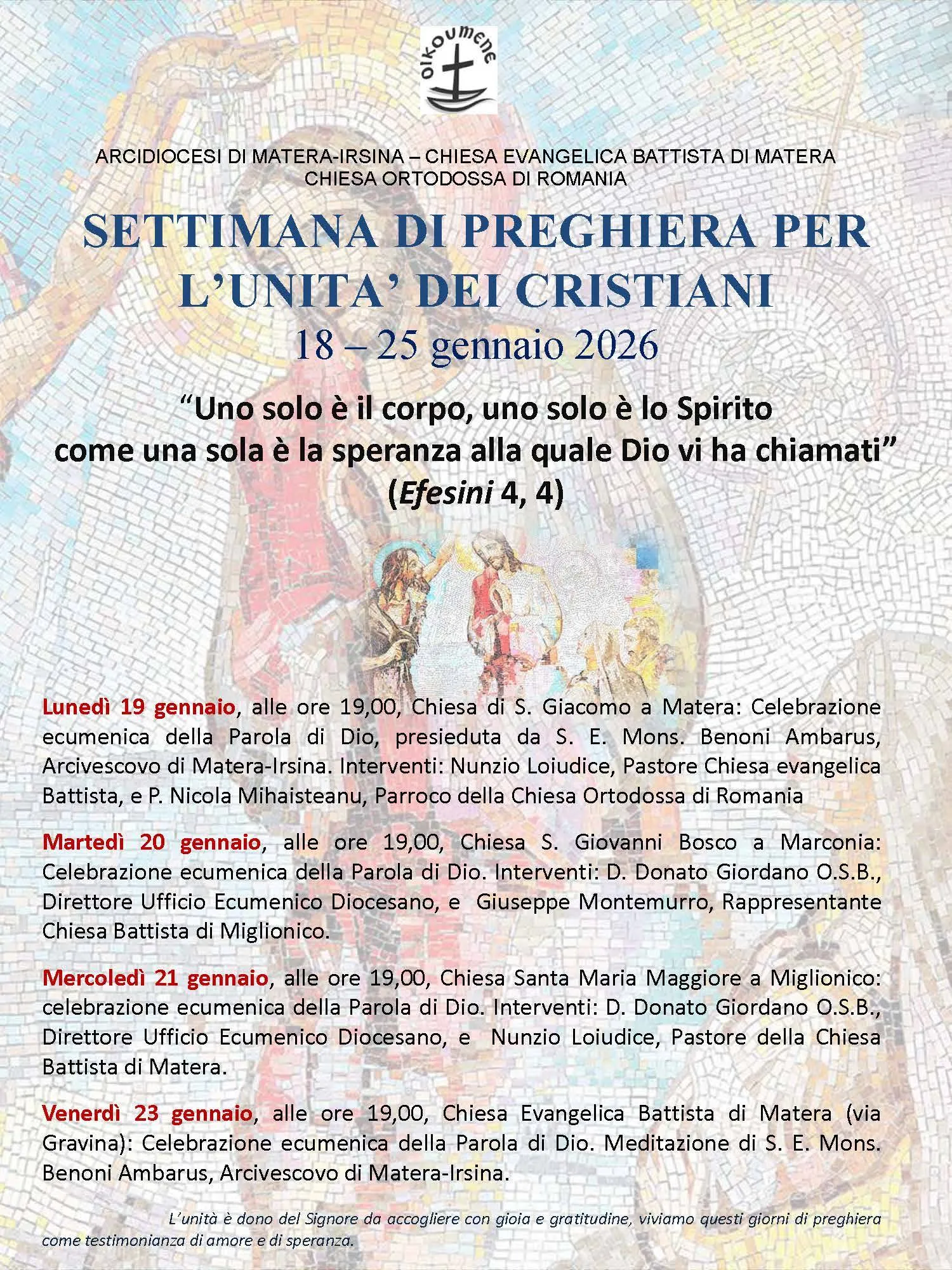 L’annuale appuntamento della Settimana di preghiera per l’unità dei cristiani, 18-25 gennaio, ci invita a riflettere sul testo guida per il 2026, che è il capitolo 4, 1-13 della Lettera di Paolo agli Efesini, in cui si evidenzia soprattutto il versetto 4: «Un solo corpo e un solo Spirito, come una sola è la speranza alla quale siete stati chiamati».