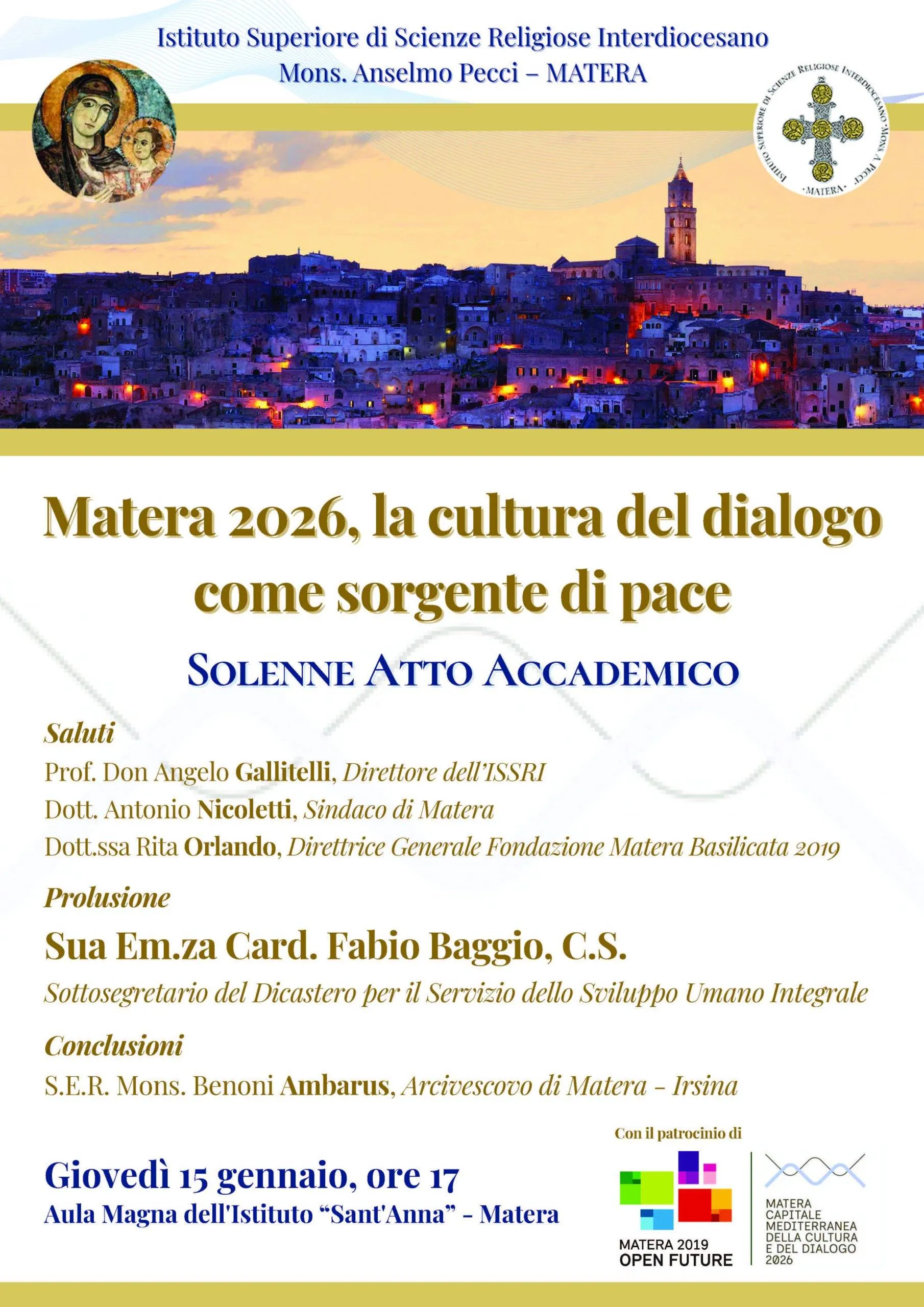 L’incontro, dal titolo “Matera 2026, la cultura del dialogo come sorgente di pace”, si inserisce nel percorso di riflessione culturale, sociale ed ecclesiale che accompagna il cammino di Matera verso l’anno di Capitale mediterranea della cultura e del dialogo che prenderà il via il prossimo 20 marzo.