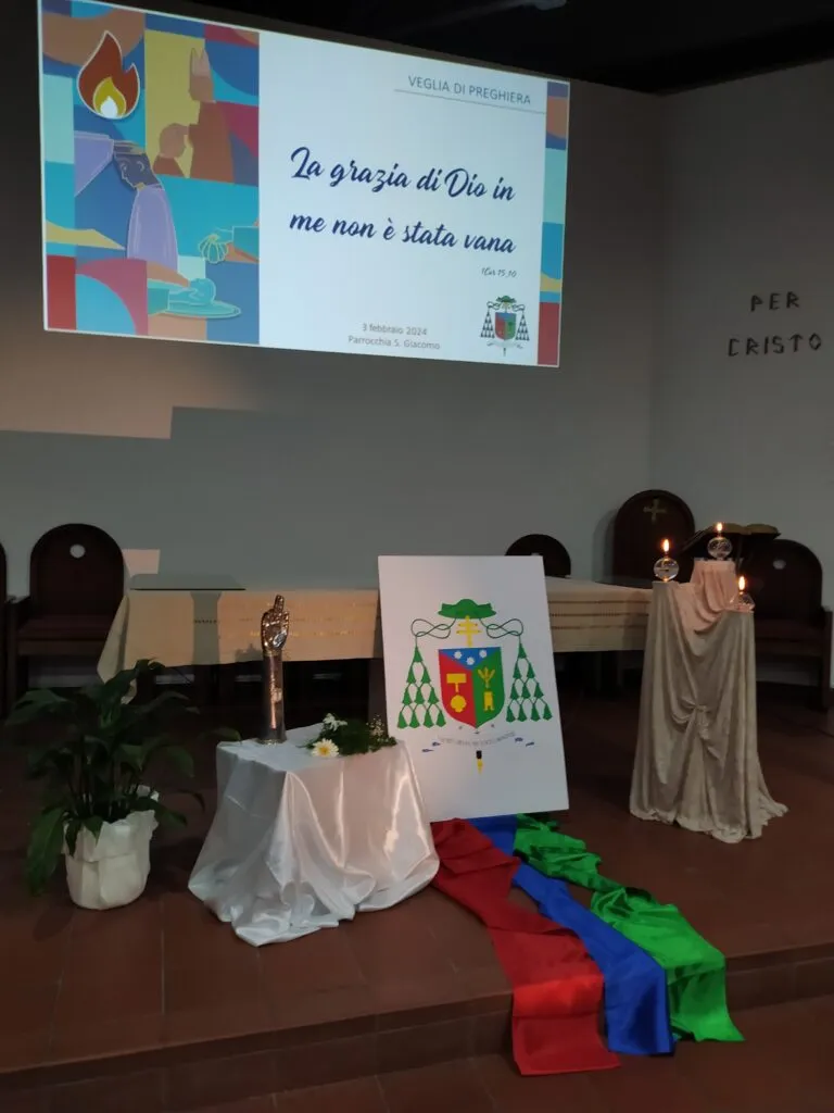 La veglia di questa sera prende il nome dal motto che don Biagio ha scelto per il suo ministero episcopale “La Grazia di Dio in me non è stata vana” (1Cor 15,10). La grazia, che ci viene donata in modo gratuito in ogni momento della nostra vita, è in grado di trasformarci realmente nella misura in cui ci apriamo ad essa, la riconosciamo e la lasciamo agire in noi. Questa sera, guidati dalla simbologia dello stemma episcopale di don Biagio e sotto la protezione di san Biagio la cui reliquia è posta accanto allo stemma, desideriamo ricostruire questa storia di grazia e di salvezza.