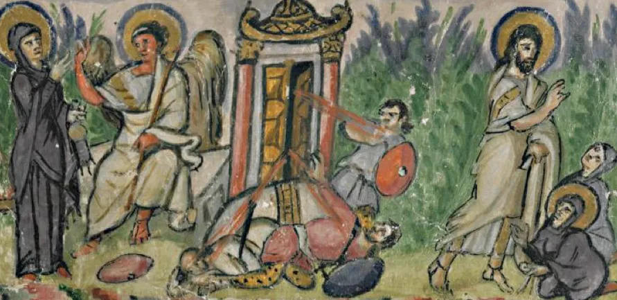 Il racconto della risurrezione secondo Matteo si apre in un tempo sospeso tra notte e aurora; le donne si recano al sepolcro «all’alba del primo giorno della settimana». Questo dettaglio temporale richiama la nuova creazione (Gen 1), indicando che con la risurrezione inizia un tempo nuovo. Esse rappresentano la Chiesa nascente, vigilante nella notte della prova. Siamo nel passaggio tra un mondo che si chiude e uno che nasce. La risurrezione non è solo un evento che riguarda Gesù, ma l’inizio di un tempo nuovo che coinvolge tutta la storia.