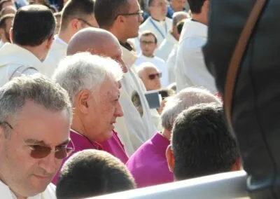 Siamo quindi tutti chiamati ad essere discepoli missionari. Ma da dove viene questa forza che ha spinto la Chiesa ad evangelizzare durante i secoli? Essa proviene, come afferma con enfasi il Concilio Vaticano II, dall’Eucaristia. Infatti, la Chiesa viene e trae la sua forza da questo Sacramento (cfr. LG, 11). L’Eucaristia è il canale attraverso cui pulsa tutta la vita della Chiesa. Dio stesso si comunica e dà vita e la rinnova, perdona e costituisce la Chiesa, una, santa, cattolica e apostolica. Nello stesso tempo è attraverso l’Eucaristia che la Comunità ecclesiale cresce e si sviluppa anche se il sacerdote dovesse celebrare da solo. San Giovanni Paolo II, nella Lettera Enciclica “Ecclesia de Eucharistia”, ha ricordato questo mistero in modo eloquente e per molti sorprendente (cfr. EdE, 1ss; 21ss). Sin dall’inizio della sua esistenza, la Chiesa si riconosce nella frazione del pane e nella preghiera (cfr. Atti 2, 42). Nella preghiera che in Cristo rivolgiamo al Padre sono presenti tutti, dal Papa ai vivi e ai morti e l’intera umanità, da coloro che hanno vissuto nel passato a quanti condividono il nostro presente e a coloro che vivranno il futuro. Ho appreso quest’ultima espressione da un santo argentino, il Cura Brochero, un parroco di montagna che, nella regione pre-andina, curava i fedeli poveri, abbandonati e dispersi su un vasto territorio montagnoso. Quando era già vecchio, cieco e colpito dalla lebbra, ha scritto ad un suo amico Vescovo: “Ringrazio il Signore per questo tempo di ozio che mi concede, perché mi dà la possibilità di pregare per quelli del passato, del presente e del futuro”. Ecco un sacerdote che ha vissuto nel cuore della Chiesa, che ha saputo interpretare il grande mistero dell’Eucaristia e della presenza attiva del Risorto nella vita e nella storia dell’umanità di tutti i tempi.