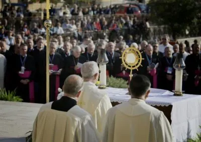 In questo ascolto a tutto campo, nell’assunzione di quello stile di dialogo che è l’indole propria della Chiesa, il cuore pulsante, il centro irradiante, fonte e culmine a cui sempre ritornare è la celebrazione dell’Eucaristia e il mistero che in essa si rinnova rendendosi visibile nel segno del pane.